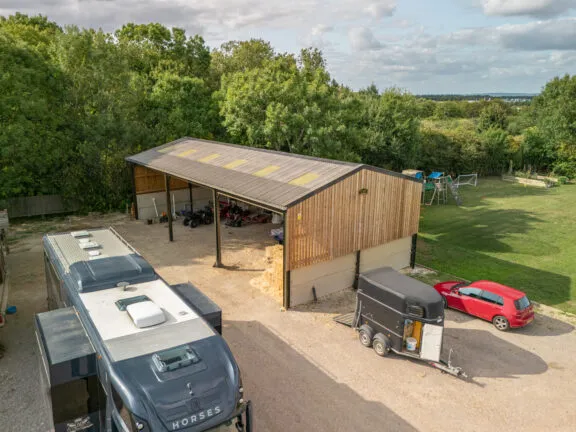 We also built a purpose-designed lunge ring for safe exercise and to protect the main arena surface, and a multipurpose barn for hay, bedding, feed, and equipment, conveniently positioned next to the stables. A new hardstanding area now provides secure parking for horseboxes and machinery.