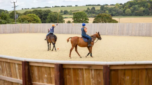70m x 35m outdoor polo arena with Martin Collins Ecotrack Premium, providing a secure surface for fast turns and high-speed training.