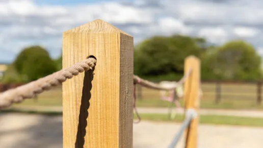 Post-and-rail paddocks with rounded corners and boarded troughs for safety and stability.